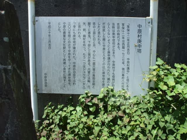 中原村庚申塔だ。享保12年(1727)の建立である。当時は疫病が流行し、他所から入ってこないように庚申講が行われていたそうだ。